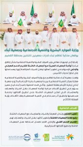 جمعية أبناء توقع مذكرة تفاهم مع وزارة الموارد البشرية والتنمية الاجتماعية ممثلة بمركز التنمية الاجتماعية ببريدة وجمعية رعاية الأيتام بالبدائع و جمعية أيادي لرعاية الأيتام بعقلة الصقور ضمن مبادرة الوزارة لتوأمة الجمعيات المميزة مع الجمعيات الناشئة بهدف تقديم الدعم المعرفي والإداري ونقل الخبرات لها لتطوير أعمالها وتحقيق أهدافها.