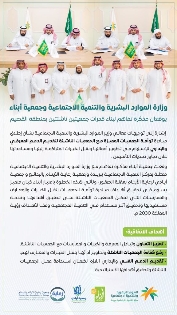 جمعية أبناء توقع مذكرة تفاهم مع وزارة الموارد البشرية والتنمية الاجتماعية ممثلة بمركز التنمية الاجتماعية ببريدة وجمعية رعاية الأيتام بالبدائع و جمعية أيادي لرعاية الأيتام بعقلة الصقور ضمن مبادرة الوزارة لتوأمة الجمعيات المميزة مع الجمعيات الناشئة بهدف تقديم الدعم المعرفي والإداري ونقل الخبرات لها لتطوير أعمالها وتحقيق أهدافها.